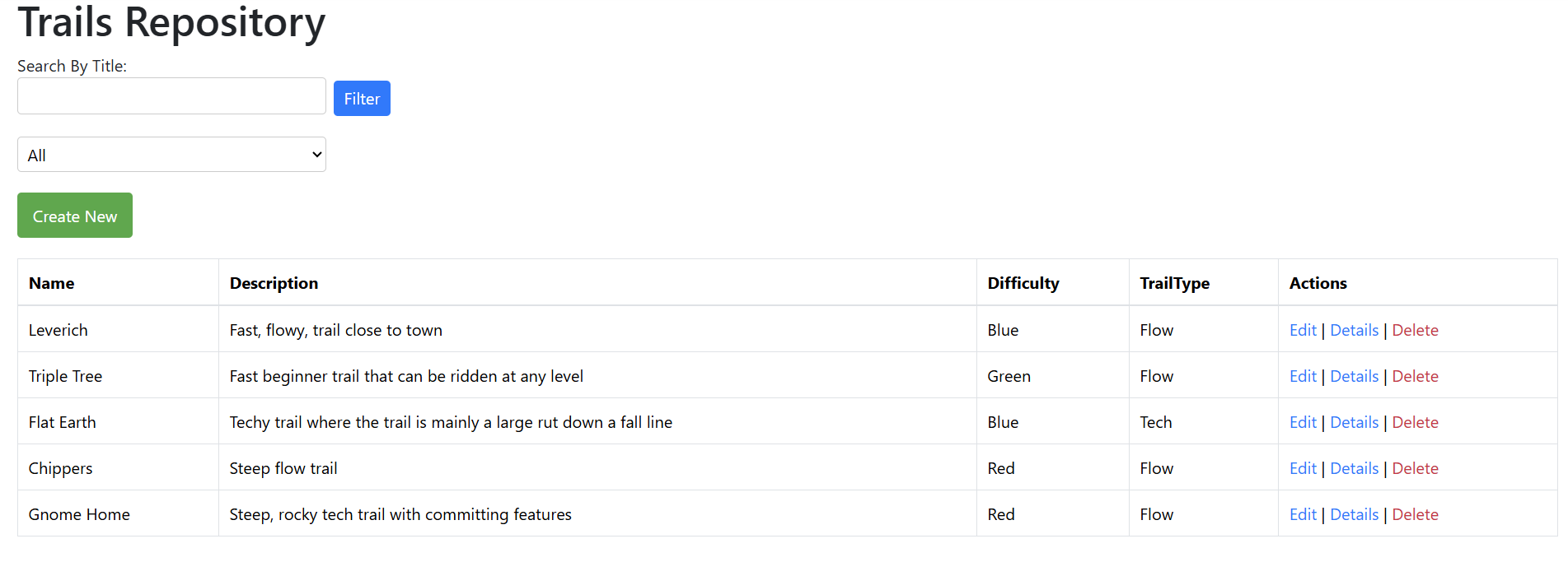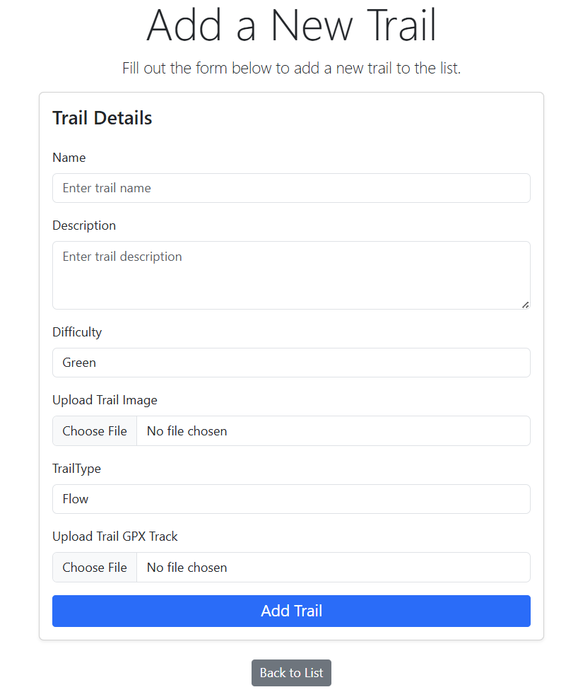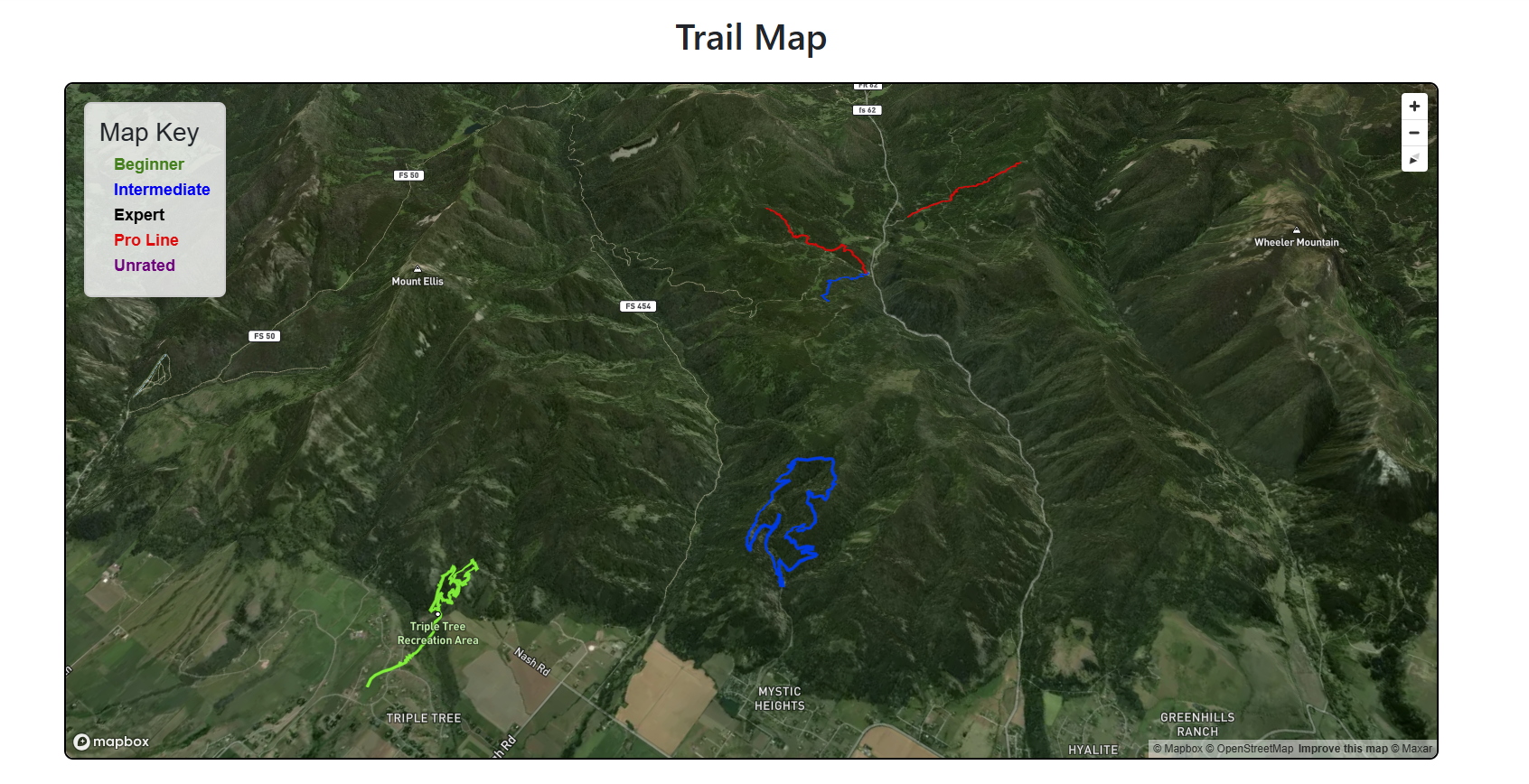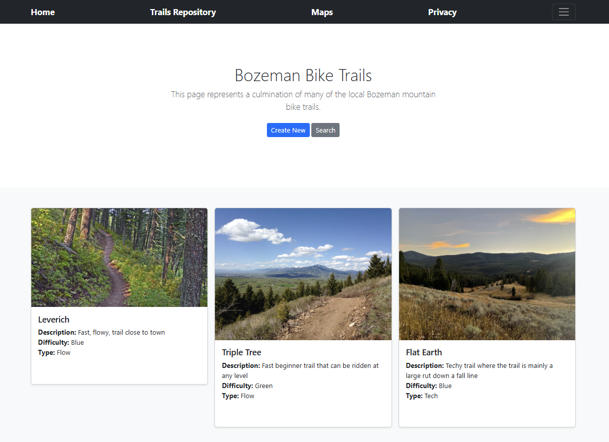 Description: I created a basic web application that allows users to log different mountain bike trails in the Bozeman community. A user is able to keep a list of trails that they have ridden as well as plot it on a 3d map. Once they add the trails that they have ridden, it will show up on the home page with the description, difficulty, as well as other trail descriptors. Users are also able to search for trails based off of trail name, trail difficulty, and trail type.
