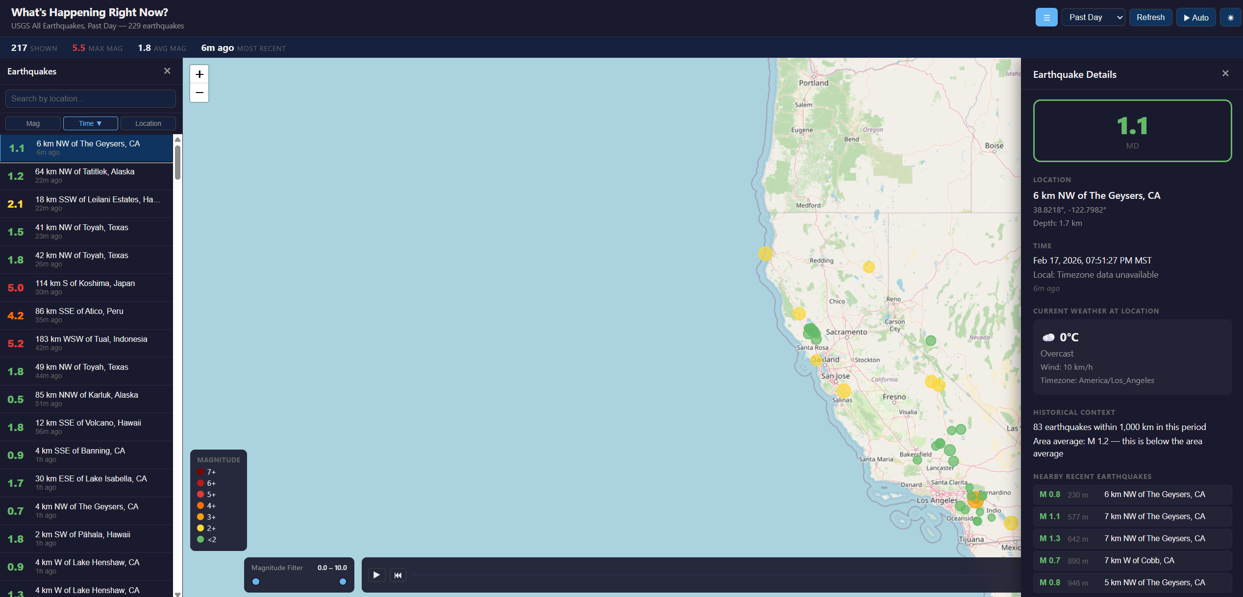 Description: For this project, I wanted to experiment with Vibe Coding. I had previously used few CLI coding tools, and I thought it would be cool to see what I could build. I also wanted to create this project using technologies that I had not used in the past like React, NodeJS, and TypeScript. For this project, I created an earthquake tracker that allowed users to view where and when earthquakes were happening around the world as well as information about the area like the weather. Overall, this was a cool experience see what these tools could build in such a short amount of time considering my previous knowledge on the technologies used. I learned about the importance of the first prompt as well as the importance of concise questions and bug descriptions. For this project I wrote zero code by hand. It was done only through prompting and agent.